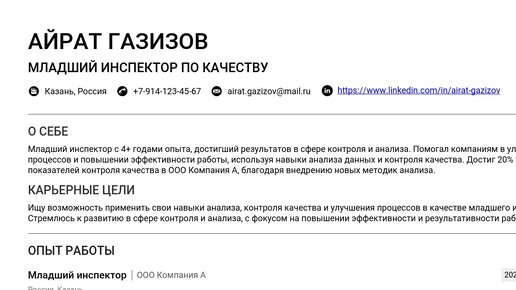 Пример резюме младшего инспектора 2025