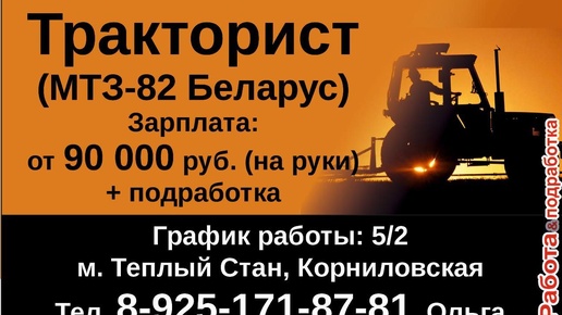 Тракторист в управляющую компанию (МТЗ-82 «Беларусь») Работа в районе м. Теплый Стан Обязанности: - Управление трактором МТЗ-82 «Беларусь»; - Выполнение сельскохозяйственных и коммунальных работ; - Поддержание техники в исправном состоянии. График работы: 5/2, с 8:00 до 17:00. Зарплата: от 90 000 рублей (на руки) + возможность подработки. Преимущества: - Официальное оформление по ТК РФ; - Стабильный заработок и возможность дополнительного дохода. Контактная информация: м. Теплый Стан, Корниловская...