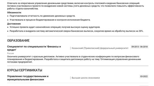 Хотите создать резюме, которое выделит вас среди других кандидатов? Изучение готового пример резюме главного специалиста казначейства поможет составить эффективный документ и быстрее получить желаемую работу. 💼 На этой странице представлен готовый пример резюме главного специалиста казначейства, а также детальные пошаговые инструкции по заполнению всех ключевых разделов, учитывающие актуальные требования работодателей и необходимые навыки: Материалы полезны как для начинающих, так и для опытных специалистов, стремящихся создать эффективное резюме...