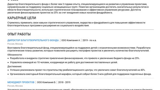 Пример резюме директора благотворительного фонда 2025