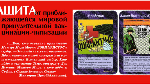 «…Тот, кто осознано принимает Матерь Мира Марию ДЭВИ ХРИСТОС в сердце, — Защищён на все сто процентов. Ибо, с помощью такой проверки душ осуществляется Вселенский отбор. Кто идёт в услужение Тьме, отвергнув Дух Истины Матери Мира, а кто идёт к Софии, в Сияние Золотого Света» (Виктория ПреобРАженская). Многие начали понимать, что на планете приближается насильственная вакцинация-чипизация. Для этого тёмными сейчас созданы все условия...