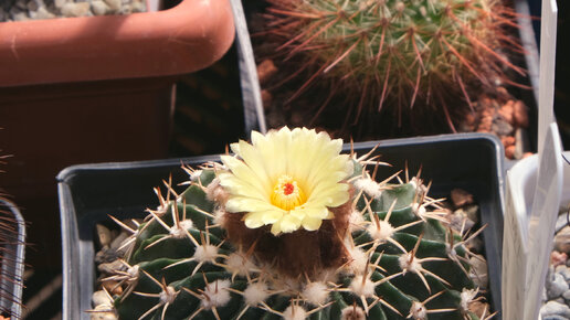 Цветет кактус вейнгартия, на бирке которого стоит название Weingartia neoarechavaletae fa. kovarikii. Я погуглил и нашел еще кучу подходящих синонимов - Notocactus neoarechavaletae f. kovarikii, Parodia neoarechavaletae, Wigginsia kovarikii. Правильные это синонимы или нет, какое название сейчас является основным, я не знаю...