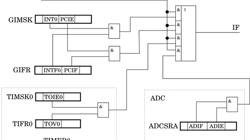 В документации на микроконтроллеры AVR не приводится даже функциональной схемы контроллера прерываний. Максимум, что можно увидеть, прямоугольник с надписью "Interrupt Unit". Поэтому в сегодняшней статье некоторые иллюстрации будут нарисованы мной, на основании моего опыта, а не взяты из документации. Прошу это учитывать. Принцип построения контроллера прерываний в AVR, в самых общих чертах, описан в статье Микроконтроллеры для начинающих. Часть 57. Прерывания в разделе "Несколько источников, несколько обработчиков"...