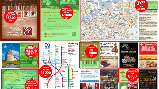Цены вполне демократичные, учитывая количество плюсов, которые получает рекламодатель: от модуля, разработанного профессиональным дизайнером, до распространения в самых туристических местах города: Дворцовая площадь, площадь Восстания, крупнейшие музеи, десятки отелей...