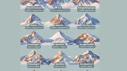 Это самые высокие вершины мира, где Эверест самая высокая. При этом, Эверест, каждый год растет примерно на 5 мм. И все эти высоченные вершины облетают самолеты, поскольку летать в Гималаях им запрещено: На других континентах горы значительно ниже. Самые высокие из них вот: На американских материках и в Африке: Самое высокогорное озеро планеты находится в Южной Америке на границе Аргентины и Чили в Андах, оно выше Эльбруса, и расположилось на высоте 6480м: Это гора Кайлас, высотой 6638м. на нее никогда...