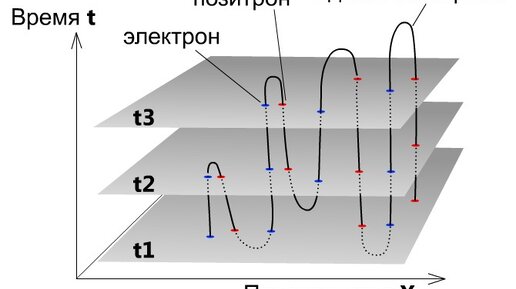 Есть одна история, о которой рассказывал Ричард Фейнман на своих знаменитых чтениях. Однажды, поздним вечером Фейнману позвонил его преподаватель Джон Уилер и предложил идею одноэлектронной Вселенной, в которой существует всего один электрон. По его версии один электрон двигаясь по временной координате Вселенной туда-сюда образует все электроны, которые мы можем наблюдать в какой-либо момент времени. Кроме этого, двигаясь во времени в одном направлении образуются электроны, а движение в обратном временном направлении образует позитроны (аналог электрона с положительным зарядом)...