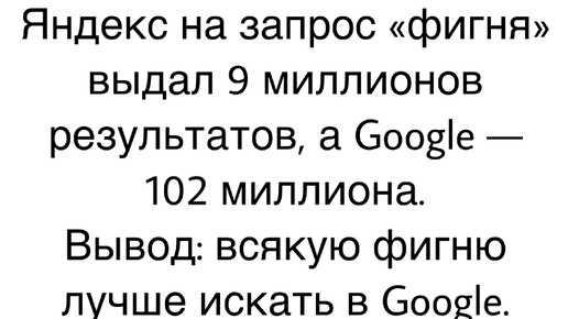 Анекдот Совет. Если женщины не обращают на вас внимания — попробуйте возглавить банк. Анекдот Выступает президент государства: — В этот раз мы готовы к новому кризису, наши валютные резервы крепки, нам ничего не угрожает… Голос из зала: — А нам? Анекдот Яндекс на запрос «фигня» выдал 9 миллионов результатов, а Google — 102 миллиона. Вывод: всякую фигню лучше искать в Google. Анекдот Стюардесса: — Ну, что вы раскричались, что разнервничались! Подумаешь, тряхануло три раза. Обыкновенная воздушная яма, турбулентная зона...