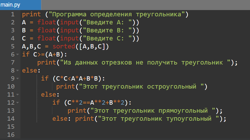 Ветвление - это один важных элементов алгоритмизации. Можно сказать, что это примитивный фильтр. Где отбор проходит по одному или нескольким условиям. Даже банальное сито - это своеобразный фильтр и как следствие вариант ветвления. По которому мы разделяем крупу, песок или что-то ещё. Сперва предыдущие задачи по данной теме: А теперь текущая задача: Задача 9: Дано: Даны действительные и положительные числа: A, B, C. Вводятся с клавиатуры. Задание 1: выявить можно ли получить треугольник с длинами сторон A, B, C...