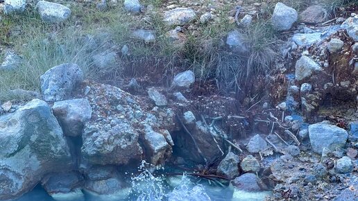 Мы с нашими гостями из России до самого вечера отдыхали в диком онсене. Уезжать из этого сказочного места не хотелось! Но в горах темнеет рано, а нам предстояло минут 30 идти пешком по лесу к поляне, где оставили машину. Лес здесь волшебный: гуляют олени; корявые деревья оплетены лианами; кругом камни, покрытые бархатным мхом; встречаются глыбы, напоминающие лица великанов. У тропинки, в камнях за высокой травой, шипят и дымят гейзеры, булькает кипяток, пахнет сероводородом. Не хотелось бы оказаться в этом лесу ночью! Мы прибавили шаг...