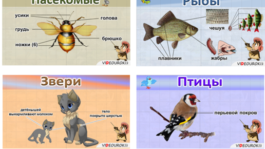 Видеоурок знакомит учащихся 2-го класса с такими группами животных, как насекомые, рыбы, птицы, звери, земноводные и пресмыкающиеся. Выделяются характерные представители этих групп. Вместе с Мудрой Совой учащиеся научатся выделять основные признаки животных разных групп...