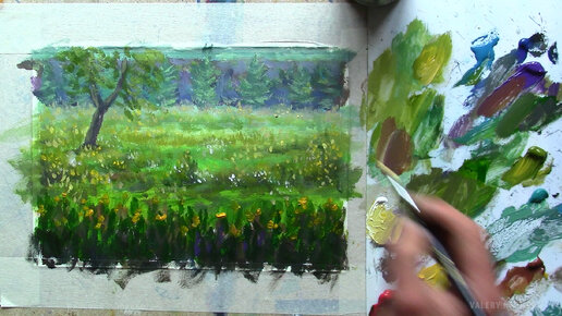 Ура! Наконец финал урока: как нарисовать поэтапно и легко красивую картину. И чтобы наша картина нравилась не только нам, но и всем людям - нам нужно сделать еще несколько несложных моментов. Берем чистый зеленый цвет, в него добавляем немного желтого цвета и эти составом рисуем вертикальными линиями стволы кустов цветов на переднем плане. Передний план - это самый низ картины. Затем этот же раствор краски разбавляем белилами немного и полученным более светлым зеленым рисуем на среднем плане небольшие кустики...