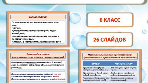 Презентацию скачать здесь Презентация «Местоимение как часть речи» разработана к уроку русского языка в 6 классе. Состоит из 26 слайдов. Данная презентация - это готовый материал для проведения урока русского языка в 6 классе. Все слайды выстроены в соответствии с этапами урока: постановка задачи, изучение новой темы, закрепление материала и подведение итогов. В основе урока лежат принципы проблемного обучения. Сначала учащиеся работают с текстами, отвечают на вопросы и самостоятельно делают выводы...