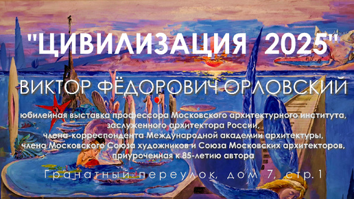 «Цивилизация 2025» - юбилейная выставка профессора Московского архитектурного института, заслуженного архитектора России, члена-корреспондента Международной академии архитектуры, члена московского Союза художников и Союза московских архитекторов, приуроченная к 85-летию автора. В Москве, в Центральном доме архитектора в доме 7 на Гранатном переулке прошла юбилейная выставка профессора МАРХИ Виктора Федоровича Орловского. Выставка, приуроченная к 85-летию автора, работала 2 - 9 декабря 2025 года...