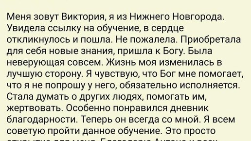 История Виктории Валерьевны Захаровой из Нижнего Новгорода — это вдохновляющее свидетельство роли духовной практики в трансформации жизни. Её путь к Духовной Экономике начался с простого отклика в сердце, когда она заметила ссылку на обучение. Никогда до этого Виктория не считала себя верующим человеком, но в итоге обрела не только новые знания, но и Бога в своей жизни. Открытость новому позволила Виктории увидеть, как Бог может участвовать в будничных делах. Она делится, что доверие и просьбы к Богу начинают исполняться — на её пути словно загорается свет...