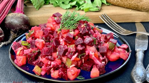 Классический рецепт винегрета без мяса состоит из простых ингредиентов: зелёный горошек, квашеная капуста, маринованные огурцы, картошка, свекла, морковь и лук. Благодаря такому составу, винегрет с горошком и солеными огурцами подходит почти под все диеты и ограничения. Мы особенно ценим этот салат за его питательность – в каждой порции содержится 7 грамм белка, 23 грамма жиров и 28 грамм углеводов. Когда я готовлю винегрет дома, всегда добавляю 500 г зеленого горошка, 5 картофелин, 10 соленых огурцов и 4 морковки...