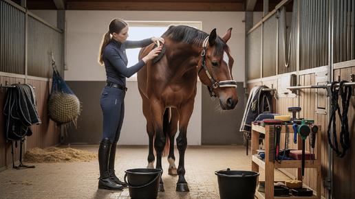 Уход за лошадью — это не только обязанность, но и способ наладить прочную связь с животным. Правильный и регулярный уход помогает сохранить здоровье, настроение и работоспособность лошади, а также предотвращает множество заболеваний кожи, копыт и суставов. Каждую тренировку или прогулку желательно начинать и заканчивать чисткой. Это не только гигиеническая процедура, но и способ осмотра лошади. Используются щётки разной жёсткости: сначала резиновая или пластиковая для удаления грязи, затем мягкая — для придания блеска шерсти...