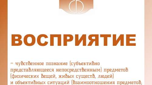 ВОСПРИЯТИЕ – чувственное познание (субъективно представляющееся непосредственным) предметов (физических вещей, живых существ, людей) и объективных ситуаций (взаимоотношения предметов, движений, событий). Для восприятия характерно специфическое переживание прямого контакта с реальным миром (чувство реальности воспринимаемого). Исторически восприятие отличалось от ощущения, которое характеризует не целостный предмет, а лишь отдельные качества, свойства, а также от мышления как сознательного размышления,...