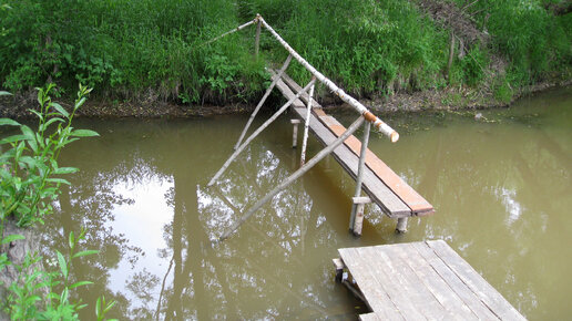 Сосед вот уже несколько лет делает через речку мостик. В дно забиты металлические столбы, на них перекладины. Весной на них прибиваются доски, и устанавливается поручень. А где-то в марте доски снимаются, чтобы их не унесло половодьем. Соседу уже 82 года, и ему тяжеловато этим заниматься, поэтому я ему помогаю. Ему нужен этот мостик, чтобы ходить на ту сторону косить траву, срубить в лесочке жердину, набрать речного песку, да мало ли чего. Там даже грибы бывают. Большую жердину мы принесли вдвоём, а маленькие я натаскал сам...