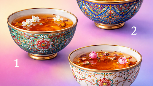 Здравствуйте, друзья! Мы привыкли полагаться на логику, советы окружающих и прошлый опыт. Но очень часто именно внутренние ощущения подсказывают нам верное направление. Интуиция, настроение, первое впечатление — всё это тихие сигналы, которые мы не всегда умеем слышать. Этот простой тест поможет понять, насколько вы доверяете своим ощущениям и умеете ли к ним прислушиваться. Посмотрите на картинку с тремя узорными пиалами. Обратите внимание на их форму, узоры и общее настроение… Просто выберите ту пиалу, которая притягивает вас первой...