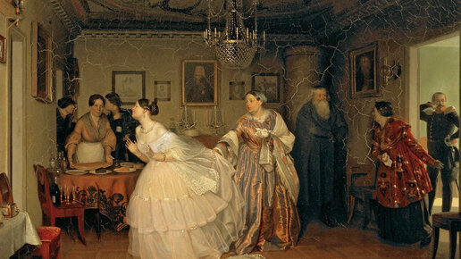 В середине 19 века русская публика пресытилась воспеванием дворянского благородства и его героев, навеянных победой над Наполеоном и декабристами. Да и жизнь аристократии в России стала портиться, вымывая остатки древнего благородия. Тут и появился художник Павел Федотов, чьи картины подмечали новые пороки русского общества. И среди них его знаменитая работа "Сватовство майора". На картине мы видим, как в богатой купеческой семье сватается русский майор к дочери купца, и эту картину надо рассматривать слева - направо как небольшую сцену кинофильма...
