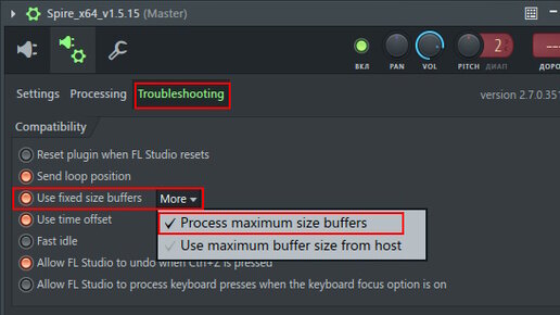 Use fixed size buffers и далее меню More> Process maximum size buffers Тогда не будет трещать ни один пресет. Очевидно, что в других DAW у Spire этой проблемы может и не быть. Но вот в FL Studio тем не менее она есть. Я однажды с похожей проблемой (треском) уже сталкивался...