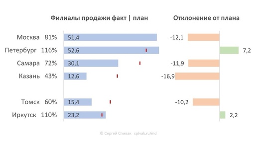 Готовый шаблон и инструкция в Excel. Максимально информативный способ показать отклонение от плана - через 4 показателя: план, фактическое выполнение , процент выполнения и отклонения от плана. И все это на одном поле! Диаграмма разделена на две части: слева отображены фактические продажи и плановые показатели, а справа — отклонения от плана. Слева акцент на фактических результатах. Плановый уровень указан с помощью одной контрастной точки. В подписях к оси указан процент выполнения плана. Это интересное решение, позволяющее избежать перегруженности диаграммы...
