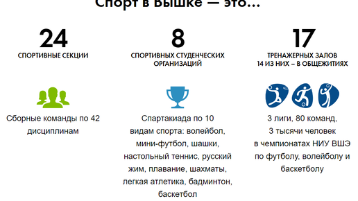 В наши дни спорт стал неотъемлемой частью жизнедеятельности почти каждого человека. Утренние и вечерние пробежки, занятия в зале, йога, ходьба и многое другое позволяют поддерживать мышцы в тонусе и совершенствовать тело. Также спорт является прекрасным способом на время забыть о своих проблемах, разгрузиться и просто отдохнуть. Регулярно занимаясь физической активностью, уменьшается тревожность, стресс, напряжение и агрессия. ВШЭ дает возможность студентам заниматься различными видами спорта, посещать специализированные секции и состоять в спортклубах...