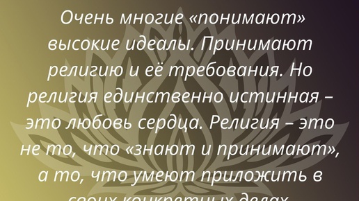 Очень многие «понимают» высокие идеалы. Принимают религию и её требования. Но религия единственно истинная – это любовь сердца. Религия – это не то, что «знают и принимают», а то, что умеют приложить в своих конкретных делах.