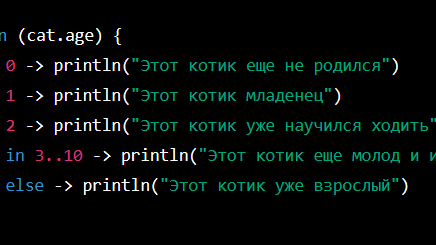 Недавно с командой обсуждали when и я решила, что это отличная тема для новой статьи. :) when — это удобная замена для if-else. Оно позволяет более красиво записывать проверки, когда у нас миллион условий. Плюс when может работать с переменными разных типов. Например, одновременно с котиками, собачками и деревьями. Давайте сначала посмотрим на самый простой пример. Предположим, у нас есть котик Cat и у него есть параметр age. В зависимости от возраста котика мы хотим писать различные сообщения: Тут мы используем when для проверки возраста котика...