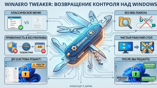 Автор: Александр П., системный архитектор. Варна. Мой компьютер — мои правила. Сегодня вторник, 17 февраля 2026 года. Утро выдалось ясным, море за окном на удивление спокойное, чего не скажешь о моей операционной системе. Настраивая новую рабочую станцию на Windows 11, я в очередной раз столкнулся с тем, как настойчиво корпорация пытается решать за меня, как должно выглядеть мое рабочее пространство и какие данные отправлять в облако. Современная Windows — это отличная платформа под капотом, но её пользовательский интерфейс и скрытые настройки часто напоминают лабиринт...