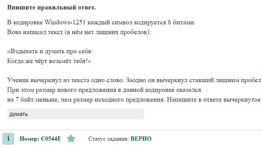 Когда же чёрт возьмёт тебя!» Ученик вычеркнул из текста одно слово. Заодно он вычеркнул ставший лишним пробел –– два пробела не должны идти подряд. При этом размер нового предложения в данной кодировке оказался