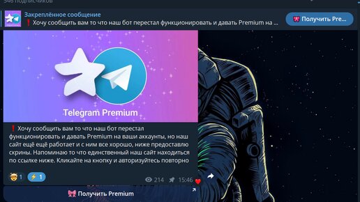 Привет всем! Хочу поделиться интересным методом, который на данный момент, 15.01.24, позволяет получить Telegram Премиум абсолютно бесплатно. Некоторые знающие люди обнаружили уязвимость, которая позволяет воспользоваться этим преимуществом! Итак, ближе к сути Заходим в канал https://t.me/premium12tg (Это не реклама). В закрепленном сообщении обнаруживаем кнопку "Получить Premium" и активируем её...
