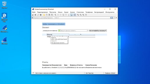 Установив приложение Wireshark можно приступить к его изучению и перехвату пакетов в сети. Запустив Wireshark первым что увидите будет окно выбора сетевого интерфейса, которые могут быть использованы для перехвата пакетов. Их количество зависит от того сколько сетевых адаптеров установлено в ПК. При наведение курсора на интерфейса можно увидеть подробную информацию (MAC-адрес, IP-адрес). В столбце Traffic в котором представлен линейный график, показывается объём сетевого трафика, проходящего через данный интерфейс в настоящий момент...