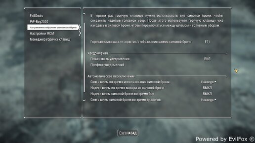 В первый раз горячую клавишу нужно использовать вне силовой брони, чтобы сохранить надетый головной убор...