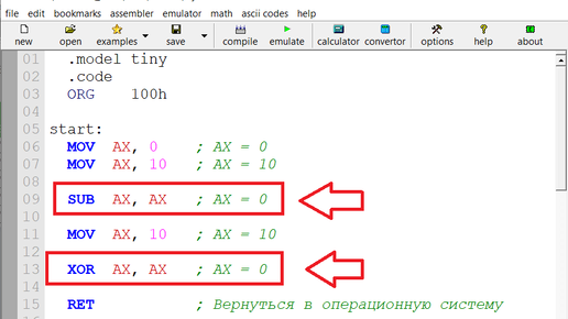 Использование XOR и SUB для быстрого обнуления регистров