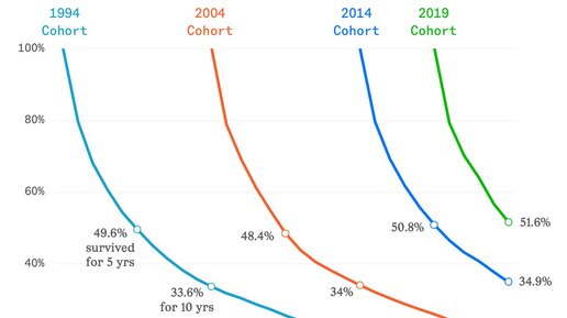 Ever checked out the survival stats of American startups based on their founding year? 📊 It's pretty wild! You’d think those founded before a crisis (like 1994—hello dot-com crash!) would struggle more than the "well-fed" ones from 2014. Spoiler: not really! 🤯 And while you might guess that the growth of venture capital and support infrastructure would boost survival rates over the past 25 years, guess again! Just like in the '90s, about half of startups born in 2019 didn’t make it past those crucial first five years...