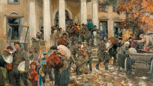 Вот крестьяне на картине художника в дни революции тащат барское имущество из усадьбы князя Долгорукова: Сам княжеский дом крестьяне, как мы видим, подожгли, он дымится. Так что старинный усадебный дом с колоннами доживает свои последние часы и минуты. Что это не абстрактная и не выдуманная усадьба, а дом именно князя Долгорукова, мы узнаём из публикации рисунка Владимирова в английском журнале The Graphic в ноябре 1917 года...