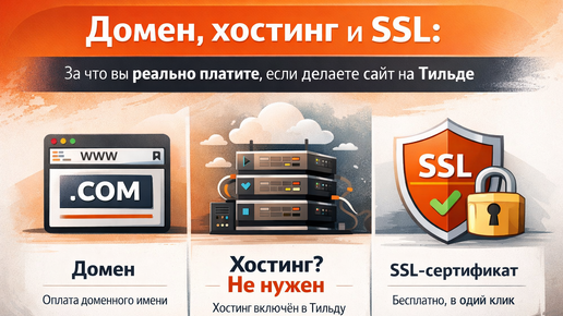 Домен, хостинг, SSL, какие‑то «обязательные» услуги при покупке — всё это выглядит сложно и пугающе. Этим часто пользуются: вам предлагают купить сразу «пакет», половина которого для Тильды просто не нужна. Разберу по шагам, что действительно требуется, а за что чаще всего переплачивают. Если коротко — минимум. Для работы сайта на Тильде вам нужны: Важный момент: хостинг вам не нужен. Сайт на Тильде размещается на стороне самой платформы...
