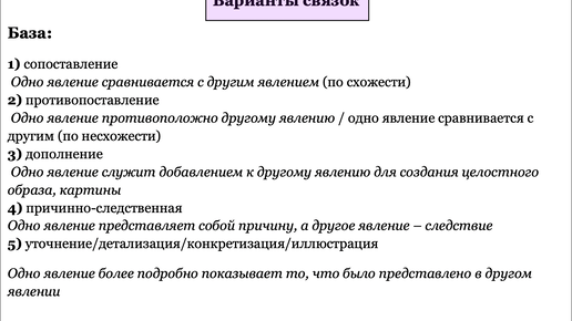 1. Противопоставление: - Это самый простой вид связи, который легко распознать. Примеры могут быть противоположными по смыслу, например, о противоположных явлениях или свойствах одного явления. 2. Причинно-следственная связь: - Примеры связаны через конструкцию "благодаря (пример 1) происходит (пример 2)". Важно, что причина и следствие могут быть расположены в любом порядке. 3. Сопоставление / сравнение: - Два примера похожи, но различаются в чём-то. Автор может отдавать предпочтение одному из них...