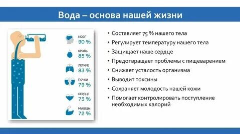 Начнем с самого просто зачем нужна вода? Основы всех основ состоят из этих 6 пунктов: НО! Что будет если воду не пить? Вода играет ключевую роль в организме человека, обеспечивая его нормальное функционирование. Она участвует во многих процессах жизнедеятельности, таких как регуляция температуры тела, транспортировка питательных веществ и кислорода к клеткам, поддержание кислотно-щелочного баланса и т.д. Если человек не будет пить воду, то он может столкнуться с обезвоживанием – состоянием, когда организм теряет больше жидкости, чем получает...