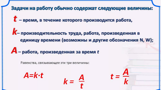 Что такое работа? Работа это первичное понятие и под ним понимают некоторый объем физически выполнимого труда выполняемых людьми или механизмами. Обозначается работа обычно через A или Q. В арифметических задачах всю работу часто принимают за 1 единицу. Что такое производительность труда? Производительность труда есть работа выполняемая за одну единицу времени. Обозначается через q и вычисляется как q=A/t вся работа делённое на время за которое она выполняется. Из этой формулы вытекает...