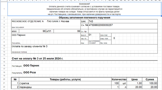 Заказ клиента - выписать счет. Гугл таблица