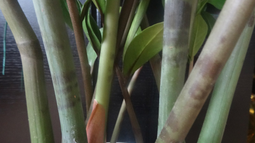 Часто на нашем любимом замиокулькасе мы можем увидеть такие темные пятна. Не всегда удается вспомнить-были они или появились вследствии каких-то условий содержания. Много информации в интернете, что это нормальное явление и всё в порядке. Я бы усомнилась-как показывает мой опыт-а он у меня большой по части залива, особенно замиокулькасов. Прежде чем понять их и приспособиться к уходу я отправила на радугу не один куст. Пятна появляются именно тогда, когда возникает перелив, либо полив холодной водой, либо на холодном подоконнике...