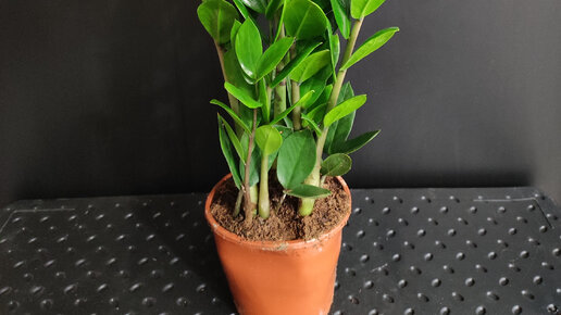 Замиокулькас (сокращ. замик), или как его называют в простонародье "долларовое дерево". Достаточно неприхотлив, если обеспечить ему минимально комфортные условия. Относится к семейству ароидные, но само по себе - суккулентного типа. (Любит редкий, но обильный полив, с полной просушкой грунта). Существует его огромное количество сортов, и не устают выводить новые. Есть более распространенные такие как: -замиофолия; -супер нова; -равен; -зензи жук; -шорт лив (вариегатный сорт). Но также есть и более редкие и дорогие: -блэк изумруд; -блэк оранж; -блэк рубин...