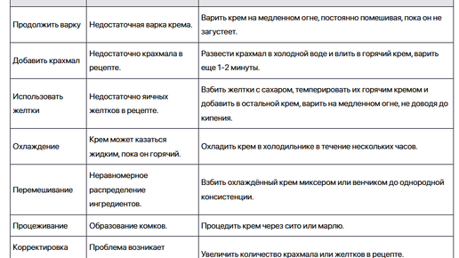 Жидкий заварной крем — распространенная проблема, но её легко исправить, если знать, в чём причина. Вот несколько способов спасти ваш заварной крем: Вот таблица с кратким описанием способов исправления...