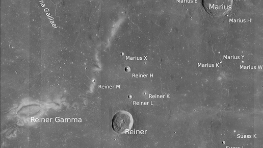 Приветствую Вас мои космические друзья! Лунные завихрения - это странные отметины на поверхности Луны, которые напоминают сливки в чашке капучино, но в гораздо большем масштабе. Они кажутся завихрениями светлой лунной пыли, которые извиваются и закручиваются причудливым образом на лунной поверхности на протяжении десятков километров. Каждый такое завихрение очень плоское и имеет магнитное поле. Что это? Ученые доподлинно не знают. Однако эти образования очень странные. Одно из таких завихрений, которое получило название Рейнер Гамма (Рейнер γ), можно увидеть в обычный любительский телескоп...