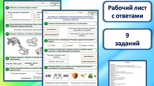 Рабочий лист скачать здесь Рабочий лист «Мир животных: земноводные и пресмыкающиеся. Особенности внешнего вида, условия жизни, передвижения, питания: узнавание, называние, описание» разработан к уроку окружающего мира во 2 классе. Рабочий лист состоит из 9 заданий. Задание 1. Соедини название группы животных с их описанием. Задание 2. Где могут жить земноводные? Раскрась кружок возле верного ответа. Задание 3. Установи соответствие. Соедини стрелкой название группы животных с представителями этой группы...