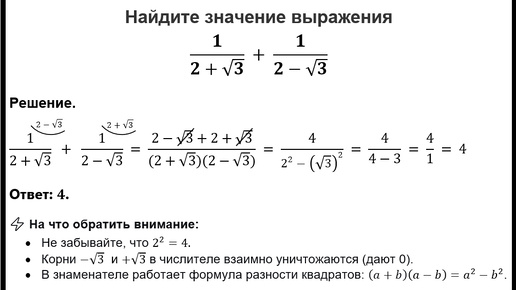 1/(2 + √3) + 1/(2 - √3) Выглядит громоздко? Сейчас увидите, что ответ вас удивит. Вспоминаем базу