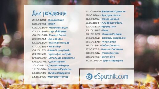 В этом месяце календарь богат не только на события, а и на родившихся в октябре знаменитостей. Поздравьте свою любимую звезду с днём рождения и пусть ваши подписчики присоединятся к этим поздравлениям. Дни рождения знаменитостей в октябре 01.10.1881 - Уильям Боинг 02.10.1951 - Стинг 02.10.1869 - Махатма Ганди 03.10.1895 - Сергей Есенин 04.10.1895 - Рихард Зорге 05.10.1713 - Дени Дидро 05.10.1864 - Луи Жан Люмьер 07.10.1885 - Нильс Бор 08.10.1871 - Иван Поддубный 09.10.1451 - Христофор Колумб 09.10...