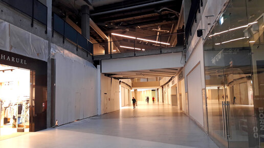 Теперь ТЦ называется Европолис (переименовали еще до закрытия), и там проведена так называемая "реконцепция". Напомню, это один из самых больших торговых центров в Европе. Мое мнение - с открытием явно поспешили, я сейчас покажу, что там творится. Вот так выглядит главный атриум торгового центра, согласитесь, мрачновато и пустовато. Главная беда - очень сильно протекает крыша, причем не где-то в одном месте, а во многих. А ведь ТЦ только после ремонта. Вот видите, на фотке на полу в нескольких местах мокренько, это накапало через дырки в крыше в результате дождя...